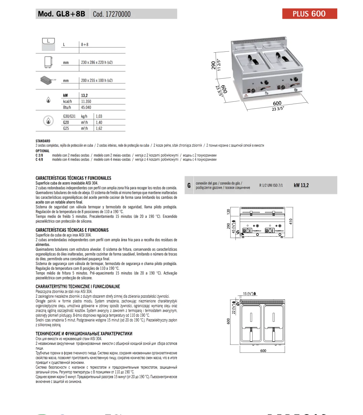 - Las freidoras a gas se caracterizan por la disposición de los tubos calentadores colocados en el interior de la cuba, lo que permite reducir los tiempos de trabajo. Cada cuba está dotada con 2 potentes quemadores tubulares de acero inox.